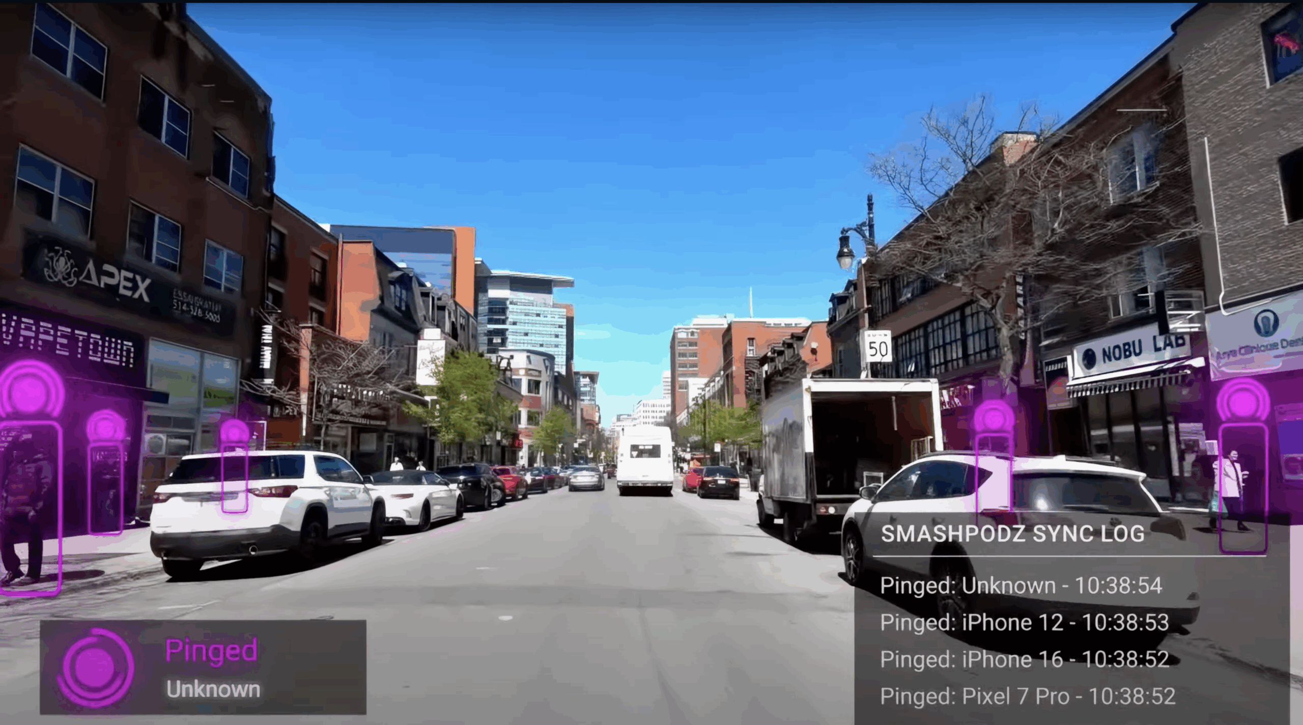 You’re watching from the point of view of a vehicle fleeing the scene of a kidnapping. The child is already gone. There are no witnesses. No license plate was recorded. No working security camera in sight. But the Smashpodz tag on the child’s clothing is still active — silently syncing with every phone it passes.